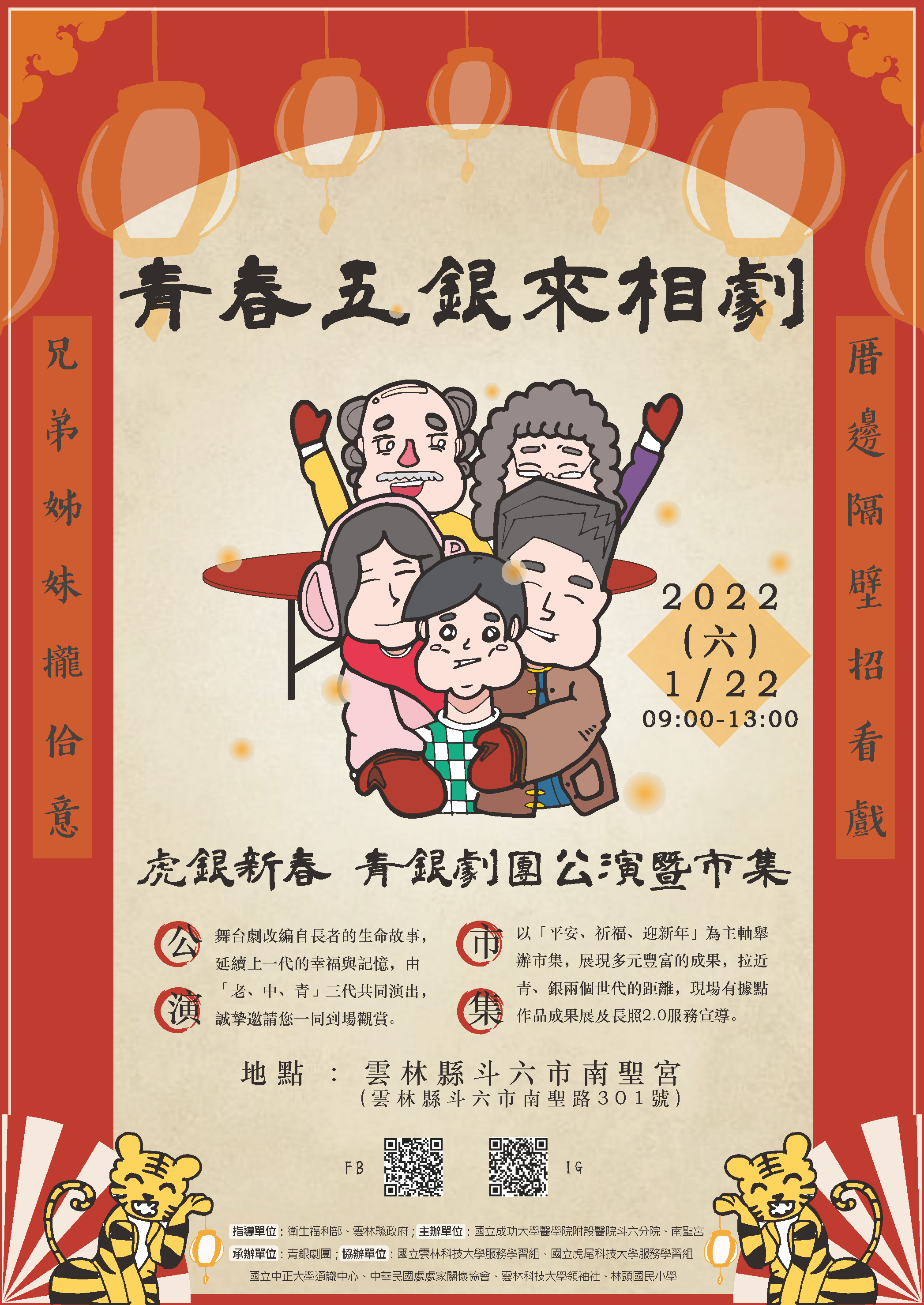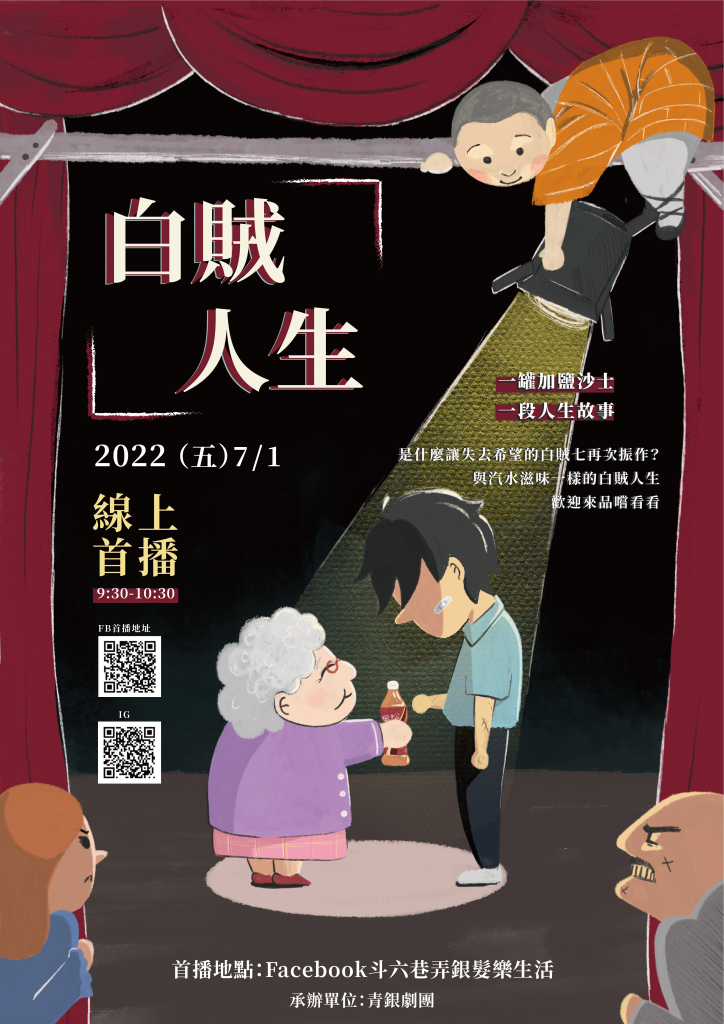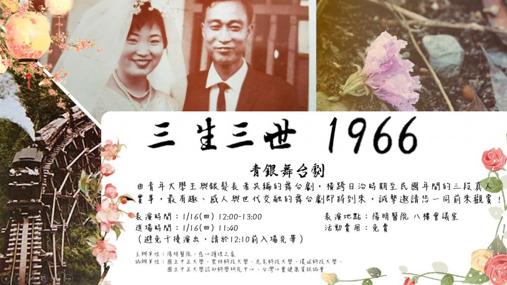 - 由青年大學生與銀髮長者共編的舞台劇,橫跨日治時期至民國間的三段真人實事,最有趣、感人與世代交融的舞台劇即將到來。
